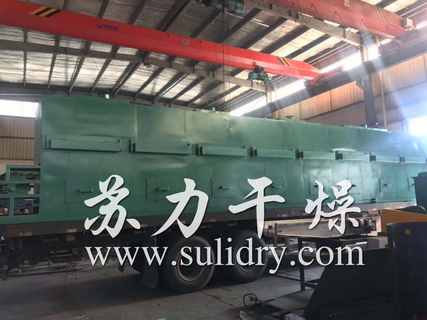 物料由加料器均匀地铺在网带上,网带一般采用12-60目不锈钢丝网,由传动装置拖动在干燥机内移动。干燥机由若干单元组成,每一单元热风独立循环,部分尾气由专门排湿风机排出,废气由调节阀控制,热气由下往上或由上往下穿过铺满物料的网带完成热量与质量传递的进程,带走物料水份。网带缓慢移动,运行速度可根据物料温度自由调节,干燥后的成品连续落入收料器中。上下循环单元根据用户需要可灵活配备,单元数量亦可根据需要选取。