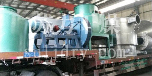 热空气切线进入干燥器底部,在搅拌器带动下形成强有力的旋转风场。膏状物料由螺旋加料器进入干燥器内,在高速旋转搅拌桨的强烈作用下,物料受撞击、磨擦及剪切力的作用下得到分散,块状物料迅速粉碎,与热空气充分接触、受热、干燥。脱水后的干物料随热气流上升,分级环将大颗粒截留,小颗粒从环中心排出干燥器外,由旋风分离器和除尘器回收,未干透或大块物料受离心力作用甩向器壁,重新落到底部被粉碎干燥。