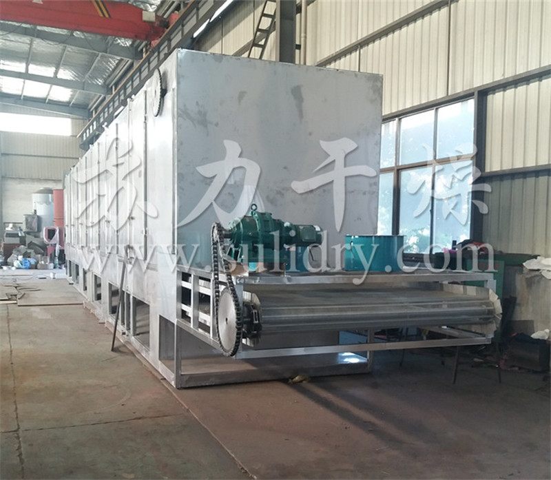 我公司生产的多层带式干燥机采用了热风多层利用的原理。主机内部由上下5层不锈钢网带组成,网带靠下面的撑杆支撑着,撑杆材质采用支撑管,两边有链条带动,链条上边有挡板,防止物料掉入轨道中间,网带固定在撑杆上。 通过送风机将换热器出来的纯净热风送到干燥机底部,先穿过^下一层网带与将干物料进行热交换带走部分水分,以此向上逐层穿过各层网带,与物料形成逆流热交换,到达^上层与^湿物料热交换后,湿空气基本达到饱和,利用引风机将湿空气通过排湿口排出室外。采用强制排湿风量,多层带式循环翻转,逐层烘干物料,充分利用热风,烘干脱水迅速,运行高效,^大程度降低能耗。