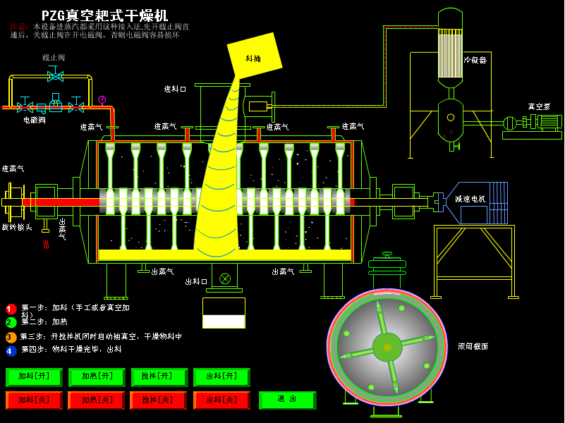 本机是一种新颖卧式间歇式真空干燥设备,湿物料经传导蒸发,带有刮板搅拌器不断清除热面上的物料,并在容器内推移形成循环流,水份蒸发后由真空泵抽出。