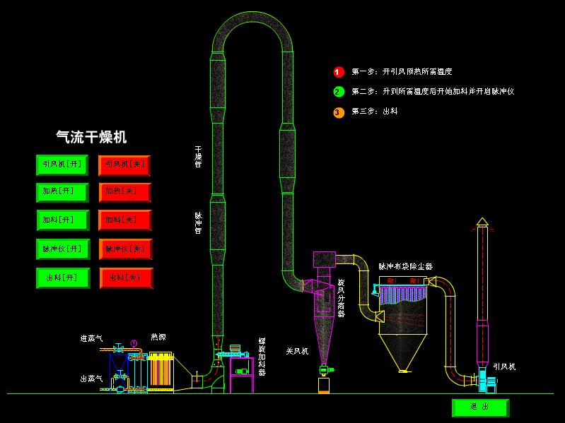 气流干燥能从易于脱水的颗粒,粉末状物料,迅速除去水份(主要是表面水份)。在气流干燥中,由于物料在干燥器内停留时间短,使干燥成品的品质得到最佳的控制。我厂强化型气流干燥是在基本型上增加一套转速可以无级调节的强化器组成,湿物料通过螺旋加料器进入强化器后和热气流充分混合,在飞速旋转的击刀击碎和推进下,物料被破碎成细颗粒,在干燥同时向出口移动,最后在风力吸引下进入干燥管,进一步均匀干燥。风力无法吸引的湿重颗粒继续被击碎、干燥、直至能被风吸起进入干燥管。