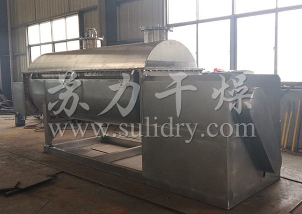 空心轴上密集排列着楔型中空浆叶,热介质经空心轴流经浆叶。单位有效容积内传热面积很大,热介质温度从-40℃到320℃,可以是水蒸汽,也可以是液体型:如热水、导热油等。间接传导加热,没有携带空气带走热量,热量均用来加热物料。热量损失仅为通过器体保温层向环境的散热。楔型浆叶传热面具有自清洁功能。物料颗粒与楔型面的相对运动产生洗刷作用,能够洗刷掉楔型面上附着物料,使运转中一直保持着清洁的传热面。浆叶干燥机的壳体为Ω型,壳体内一般安排二到四根空心搅拌轴。壳体有密封端盖与上盖,防止物料粉尘外泄而充分发挥作用。