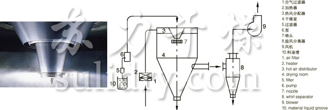 该喷雾干燥系统关键部件是一个干燥机,干燥料斗两区,电动或旋风燃气热水器,同时有一个可选的灰尘收集器。提高效率的关键之一是利用空气中的热量回到机料斗,在干燥的空气过滤后进入风机,超出分成。在一个空气流,在其他流的空气保持在如此高的温度,它需要进入上区,只有小的加热,从而节省能源。
