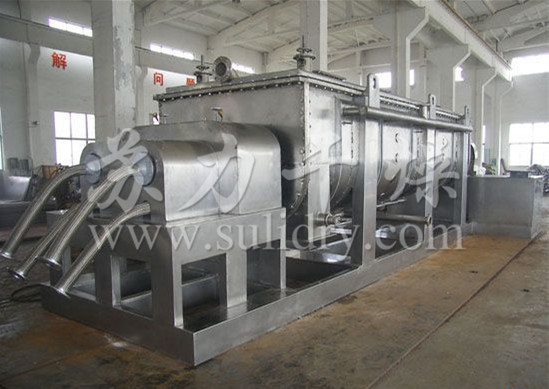空心轴上密集排列着楔型中空浆叶,热介质经空心轴流经浆叶。单位有效容积内传热面积很大,热介质温度从-40℃到320℃,可以是水蒸汽,也可以是液体型:如热水、导热油等。间接传导加热,没有携带空气带走热量,热量均用来加热物料。热量损失仅为通过器体保温层向环境的散热。楔型浆叶传热面具有自清洁功能。物料颗粒与楔型面的相对运动产生洗刷作用,能够洗刷掉楔型面上附着物料,使运转中一直保持着清洁的传热面。浆叶干燥机的壳体为Ω型,壳体内一般安排二到四根空心搅拌轴。壳体有密封端盖与上盖,防止物料粉尘外泄而充分发挥作用。