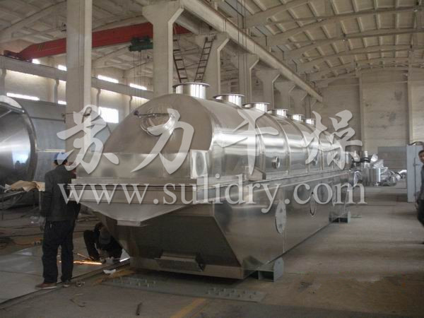 物料自进料进口进入机内,在振动力作用下,物料沿水平面流化床抛掷,向前连续运动,热风向上穿过流化床同湿物料换热后,湿空气经旋风分离器除尘后由排风1:3排出,干燥物料由排料进口排出。