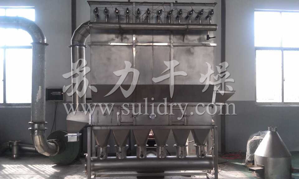 沸腾流化床,它是由空气过滤器、加热器、沸腾床主机,旋风分离器,布袋除尘器、高压离心风机、操作台组成,由于干燥物料的性质不同,配套除尘设备时,可按需要考虑,可同时选择旋风分离器、布袋除尘器,也可选择其中一种,一般来说比重较大的如冲剂及颗粒料干燥只需选择旋风分离器,比重较轻的小颗粒状和粉状物料需配套布袋除尘器,并备有气力送料装置及皮带输送机供选择。